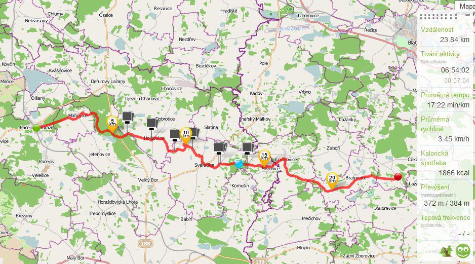 Trasa, kterou zaznamenala GPS v Bokačově kapse. Bohužel 3 km před cílem se mobil vybil :)